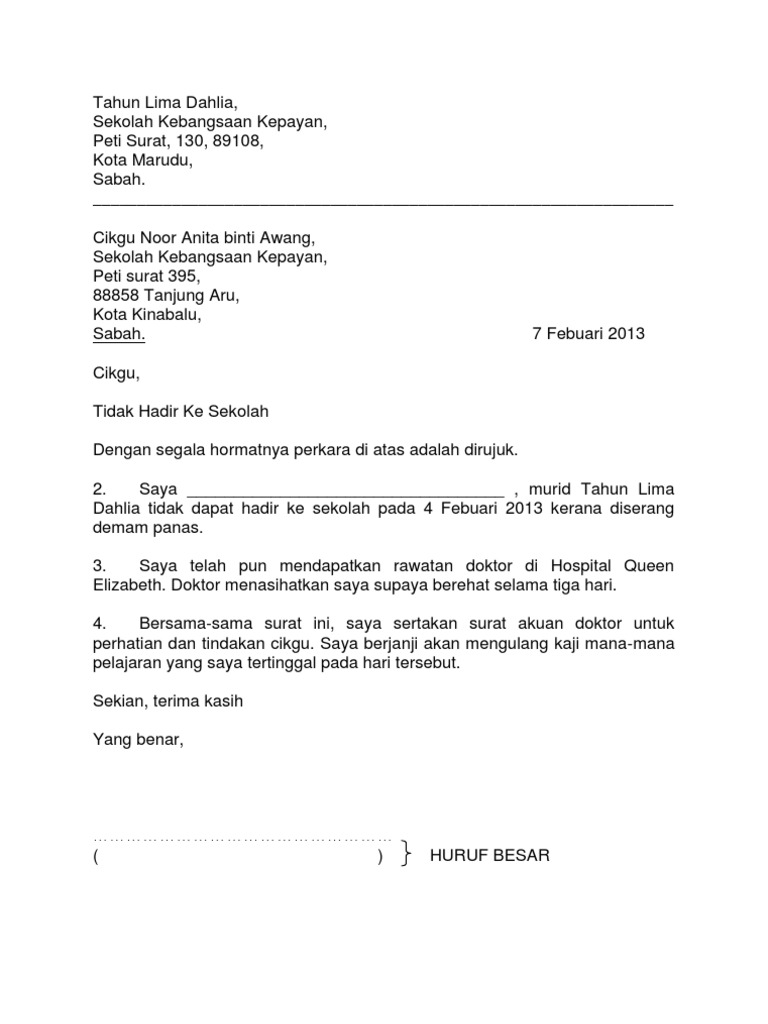 Yusrina binti halim, no 42, jalan muhibah 5, taman pandan, 82000 pontian, johor. Untuk makluman, contoh di bawah boleh digunakan untuk sebagai satu surat rasmi kepada pihak sekolah sekiranya pelajar . Surat hendaklah ditulis mengikut format surat rasmi; Contoh surat tidak hadir ke sekolah (rasmi).