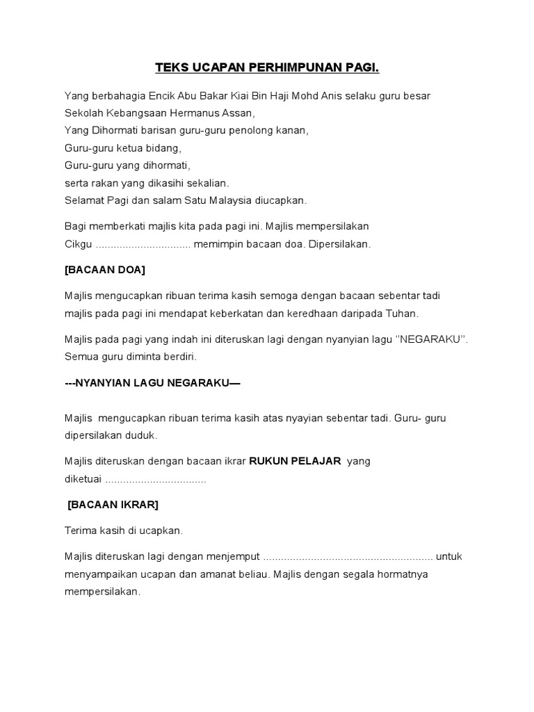 Teks Ucapan Perhimpunan Rasmi. Lees die blaaiboek weergawe van . Contoh teks pengacara perhimpunan pagi 1.